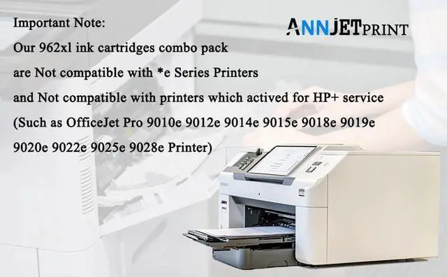 Important Note: Our 962xl ink cartridges combo pack are Not compatible with *e Series Printers and Not compatible with printers which actived for HP+ service (Such as OfficeJet Pro 9010e 9012e 9014e 9015e 9018e 9019e 9020e 9022e 9025e 9028e Printer)