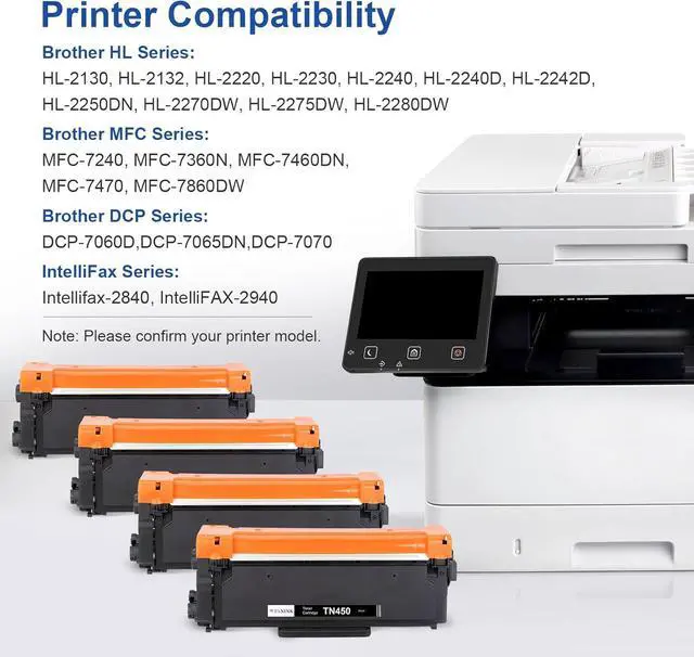 Package Contents: 4 Pack TN-450 Toner Cartridge Black High Yield Replacement for Brother TN450 TN420 Black Toner Cartridges
