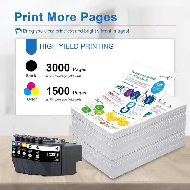 High Page Yield: Achieves up to 3,000 pages for LC3019XXL black ink cartridge, 1,500 pages for LC3019XXL color ink cartridges at 5% coverage (Letter/A4)
