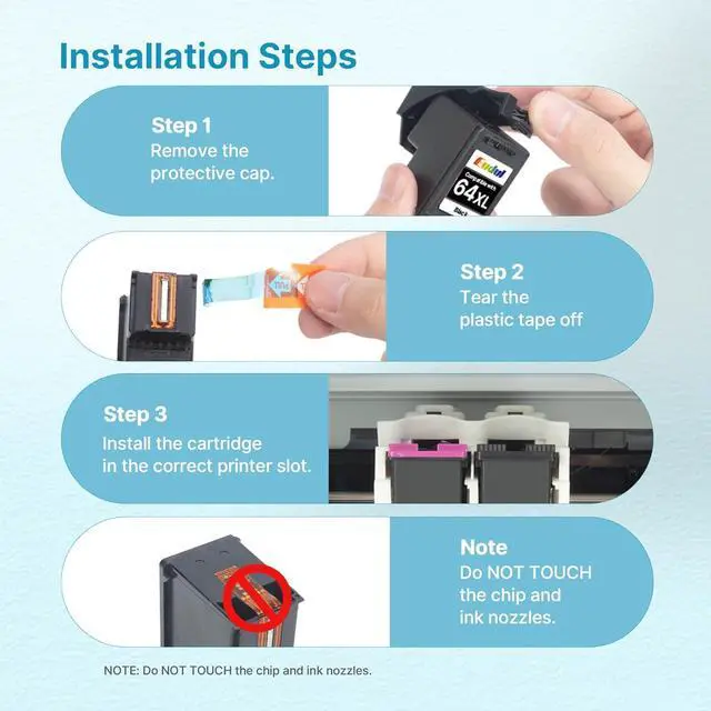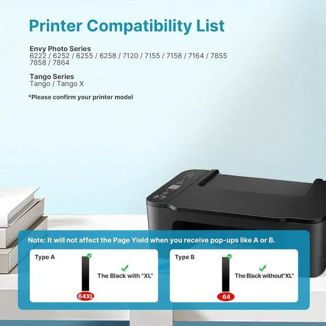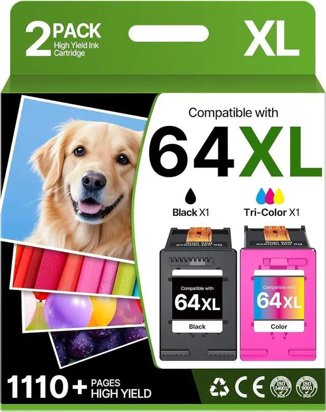 Eudul 64 Ink Cartridge 2 Pack 1 Black 164XL Ink Cartridges Replacement for HP 64XL HP Ink 64XL Black and Color Combo Pack Work for HP Envy Inspire 7955e 7958e 7255e Photo 7155 7858 7155 7100 7800 7900 7855 6222 Tango (Black Color, 2 Pack) Color Replacement for 64 Ink Higher Printing Page Yield: 630 Pages for 64XL black ink cartridge, 480 Pages for 64xl color ink cartridge (at 5% coverage of A4 paper) Package Includes: 64xl black and color combo pack xl (1 x 64xl black ink cartridge, 1 x 64xl color ink cartridge), 1 x user guide 64XL Black and Color Ink Cartridge for HP printers to Use with HP ENVY Inspire 7955e 7958e Compatible with Tango/HP Tango X Photo 6255 7155 7858 7155 7855 6222 6252 6258 7120 7158 7164 7855 7858 7864 Printer Highly compatibility: all Eudul 64XL for hp ink 64 are equipped with the latest upgrade intelligent chips, can be instantly identifed perfectly by your printer and work, bring you clear print text and bright vivid image Please note: if your printer activated the hp+ service, our Eudul 64xl for hp ink 64 can not compatible with it