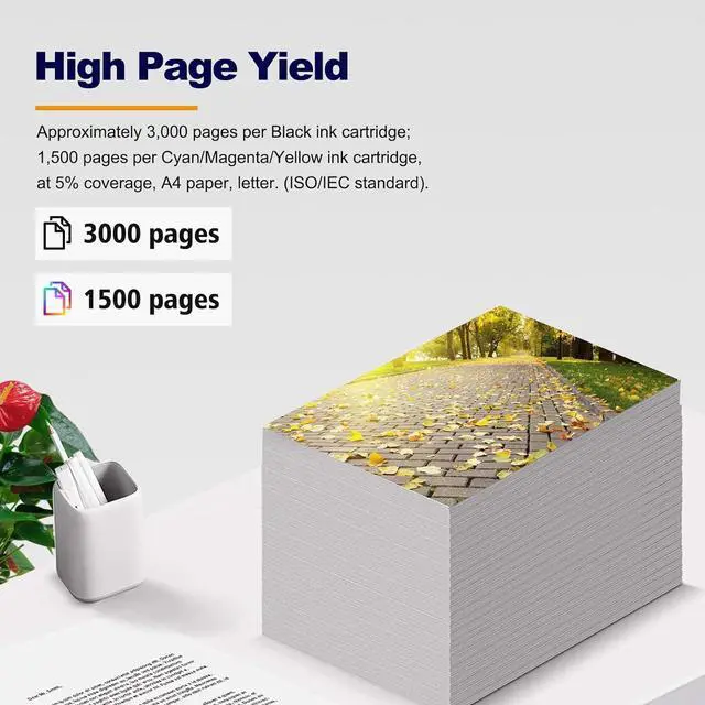 High Print Yields - - Approximately 3,000 pages per Black ink cartridge; 1,500 pages per Cyan/Magenta/Yellow ink cartridge, at 5% coverage, A4 paper, letter. (ISO/IEC standard).