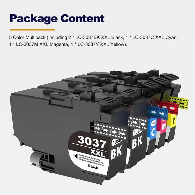 Package Contents - - 5 Color Multipack (Including 2 * LC-3037BK XXL Black, 1 * LC-3037C XXL Cyan, LC-3037M XXL Magenta, LC-3037Y XXL Yellow).