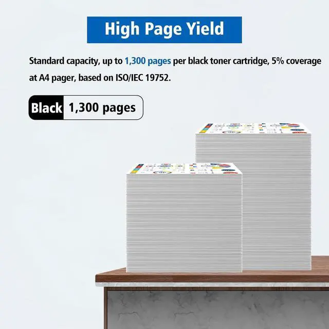 High Page Yields -- Standard capacity up to 1,300 pages per black toner cartridge (at 5% coverage on A4 paper, based on ISO/IEC 19752).