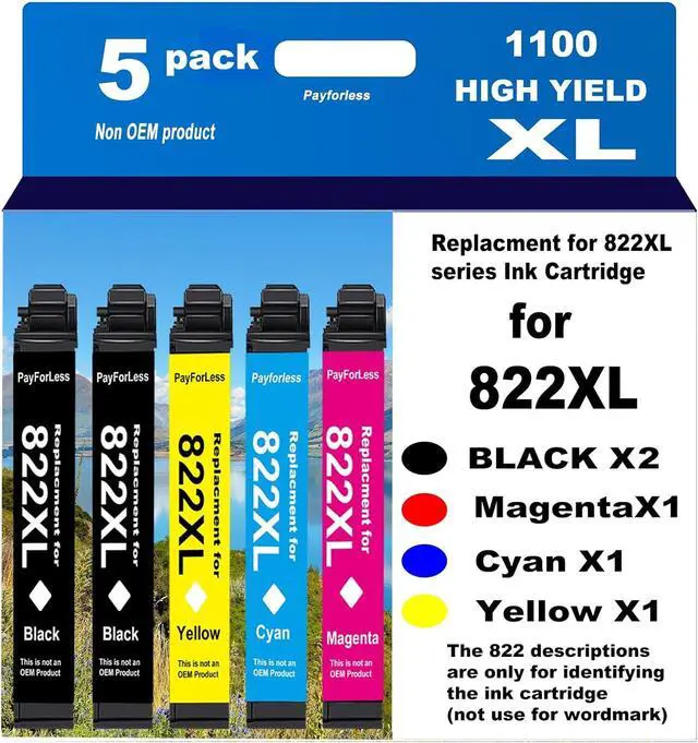 Package Contains: 5 Pack 822XL ink cartridges. 2 X 822XL Black, 1 X 822XL Cyan, 1 X 822XL Magenta, 1 X 822XL Yellow.