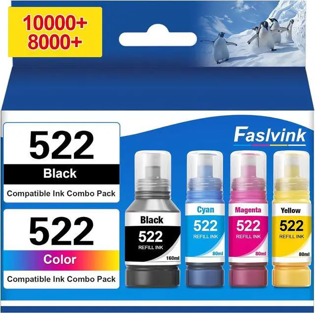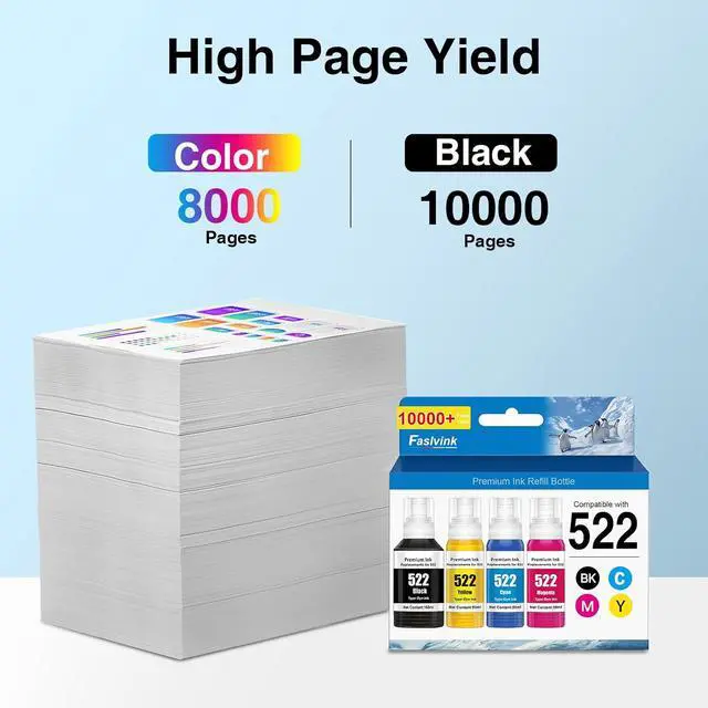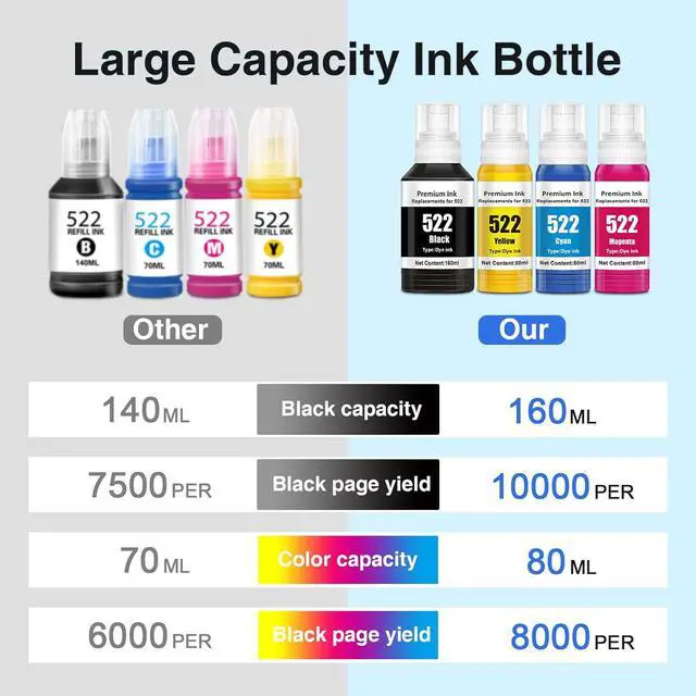 High-Yield Printing: Up to 10000 Pages per Epson 522 Ink Refill Bottles Black and 8000 page per Color 522 Ink Refill Bottles(A4 Letter, at 5 Percent Coverage)