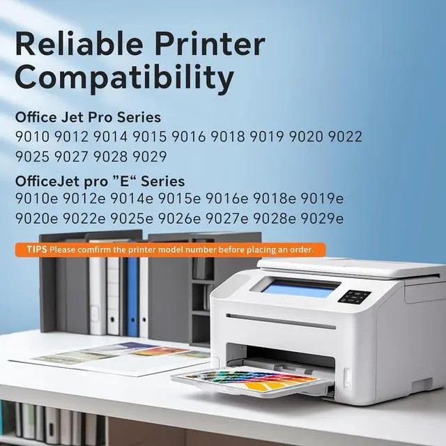 Compatible printers: This is not an OEM product. These cartridges work with: HP OfficeJet 9012e; HP OfficeJet Pro 9010, 9010e, 9014e, 9015, 9015e, 9016, 9018, 9018e, 9019, 9019e, 9020, 9020e, 9022e, 9025, 9025e, 9028e