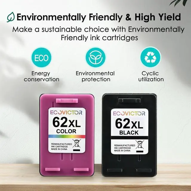 Long-Lasting Page Yield: EcoVictor 62xl ink cartridges black and color for hp ink cartridge 62 prints up to 600 pages each 62xl black ink cartridges and 450 pages each 62xl color ink cartridges(at 5% coverage). EcoVictor for hp 62xl ink cartridge combo pack is perfect for home, school, or office use. Enjoy long-lasting printing performance without the hassle of frequent replacements.