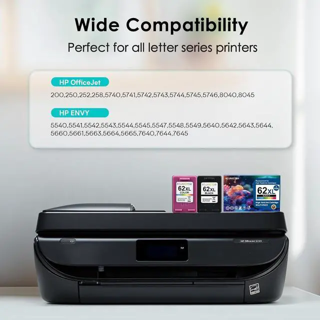Broad HP Compatibility: EcoVictor 62 xl ink cartridges black and color replacement for hp envy 7640 printer ink cartridges will work flawlessly with your HP Envy 5540 5541 5542 5543 5544 5545 5547 5548 5549 5640 5642 5643 5644 5660 5661 5663 5664 5665 7640 7644 7645 OfficeJet 200 250 252 258 5740 5741 5742 5743 5744 5745 5746 8040 8045 printer ink cartridges. Enjoy smooth, worry-free printing every time.