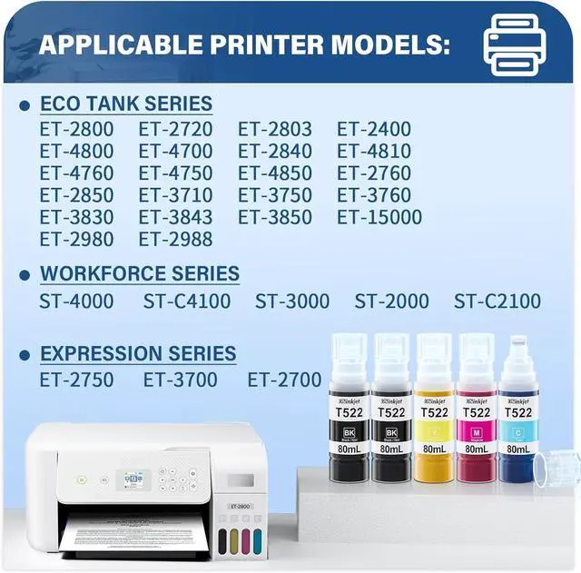 Compatible More PrinterThe 522 ink refill Bottles Replacement for Eco tank ET-2800 ET-2720 ET-2803 ET-2400 ET-4800 ET-4700 ET-2840 ET-4810 ET-3850 ET-3760 ET-2850 ET-4760 ET-2760 ET-2750 ET-15000 ET-3750 ET-4850 ET-3700 ET-3710 ET-3830 ET-4750 ET-2700 ET-2980 ET-2988 ST-3000 ST-4000 ST-2000 ST-C2100 ST-C4100 Printer ink