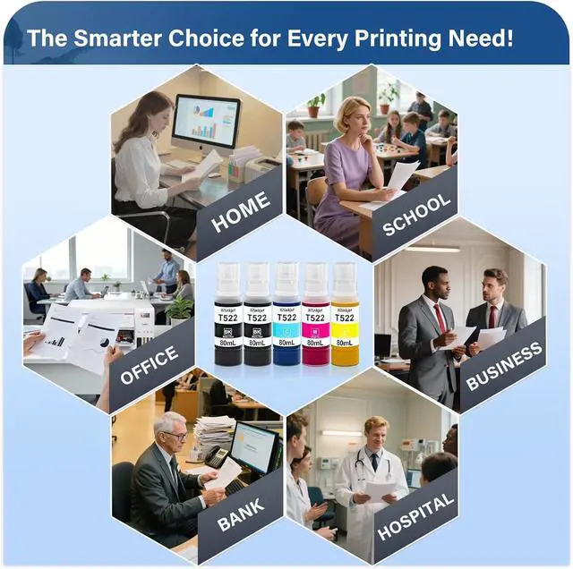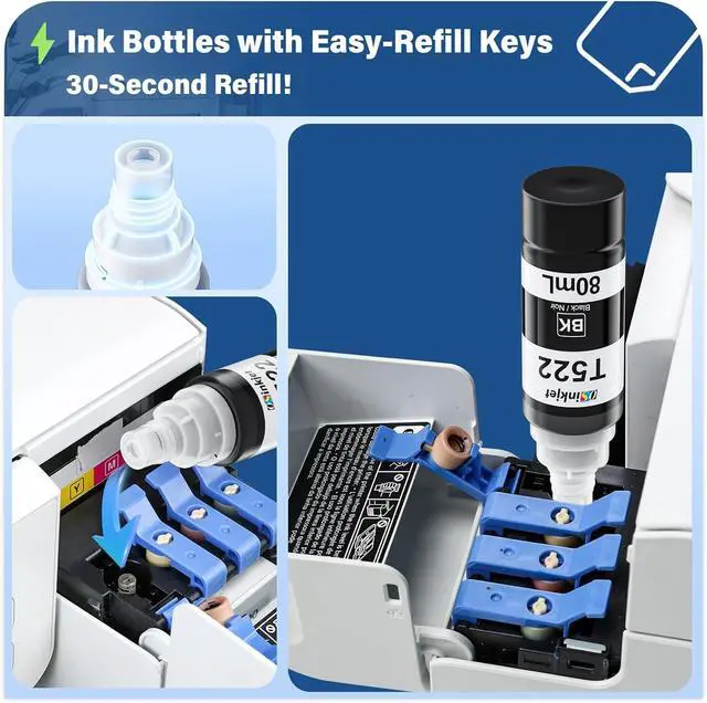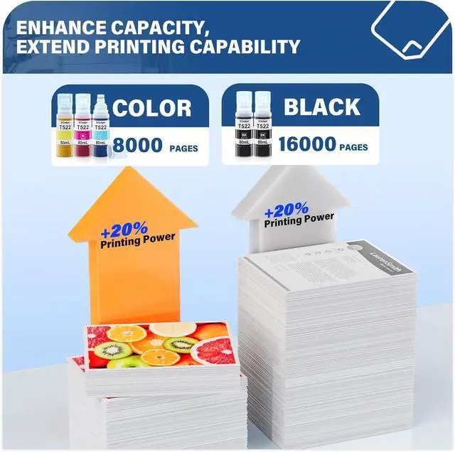 Supercharge 20%+ Printing Power: The ink 522/T522 refill bottles, with extra-large capacity, let you print up to 40,000 pages (16,000 pages in black, 8,000 pages in each color). Unleash printing efficiency with ease( at 5% coverage on A4 paper).