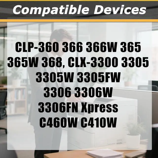 Compatible Devices: Designed exclusively for Samsung CLP-360 366 366W 365 365W 368, CLX-3300 3305 3305W 3305FW 3306 3306W 3306FN Xpress C460W C410W printers