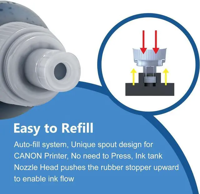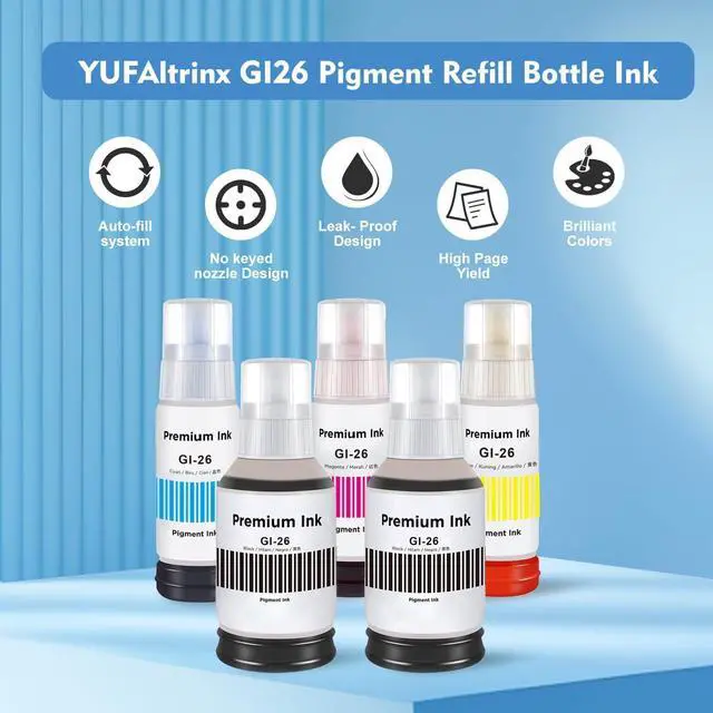 Package Contents: (NON-OEM) 2 x Compatible ink for canon gi-26 black, 1 x Compatible ink for canon gi-26 cyan, 1 x compatible ink for canon gi-26 magenta, 1 x compatible ink for canon gi-26 yellow. YUFAltrinx GI-26 pigment ink Bottle NO KEYED NOZZLE DESIGN! To refill ink, open the bottle cap, align the top with the printer's fill port, and insert it. The printer's probe will puncture the seal and automatically draw in the ink, creating a tight seal during the process
