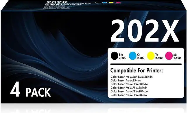 Compatible 4 Packs 202X CF500X CF501X CF502X CF503X Toner Cartridges (High Yield) for HP MFP M281fdw Toner Cartridges