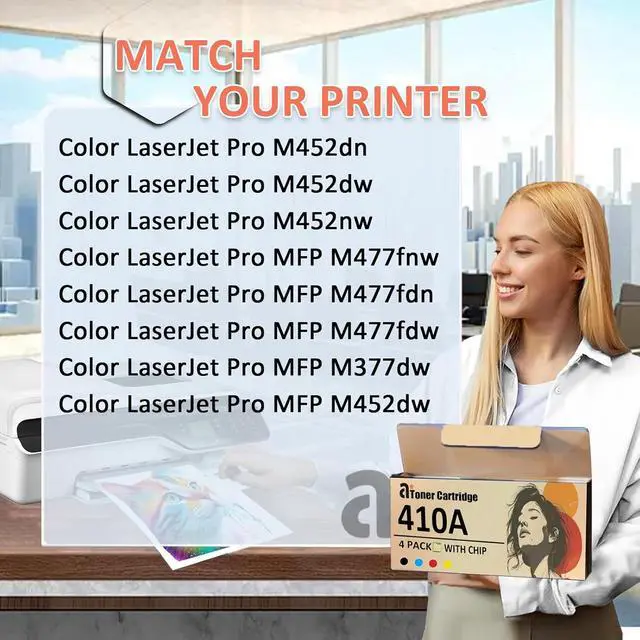 Compatible PrintersThe 410A toner cartridges compatible for HP Color LaserJet Pro M452dn M452dw M452nw MFP M477fnw M477fdn M477fdw M377dw M452dw printers