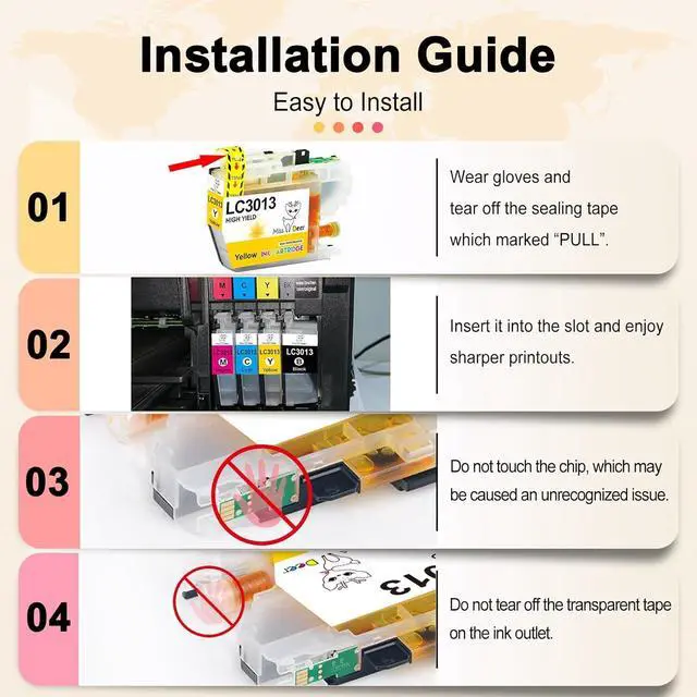 Efficient Printing Performance: Miss Deer lc3013 ink cartridges bk/c/m/y can be used for copy paper and photo paper. Specially formulated lc3013 ink cartridges make sure to print crisp documents and life-like photos. Sharp and smooth, Vibrant color, Prevents clogging