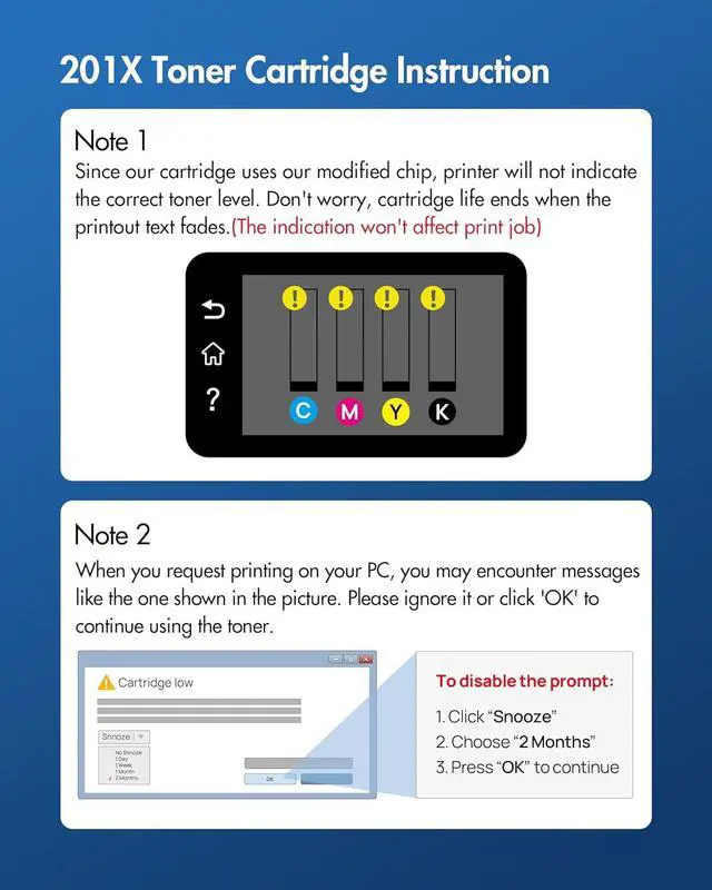 3. Package Content: 201X Toner Cartridges 4 Pack High Yeild Replcement included-1 201X CF400X Black toner, 1 201X CF401X Cyan, 1 201X CF403X Magenta, 1 201X CF402X Yellow)