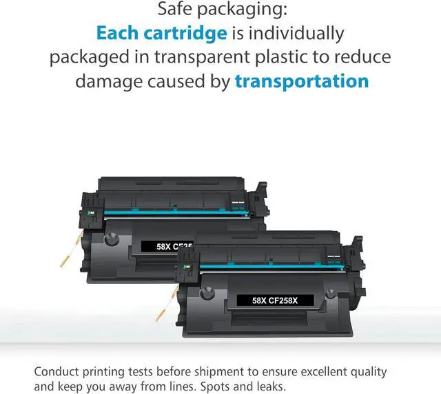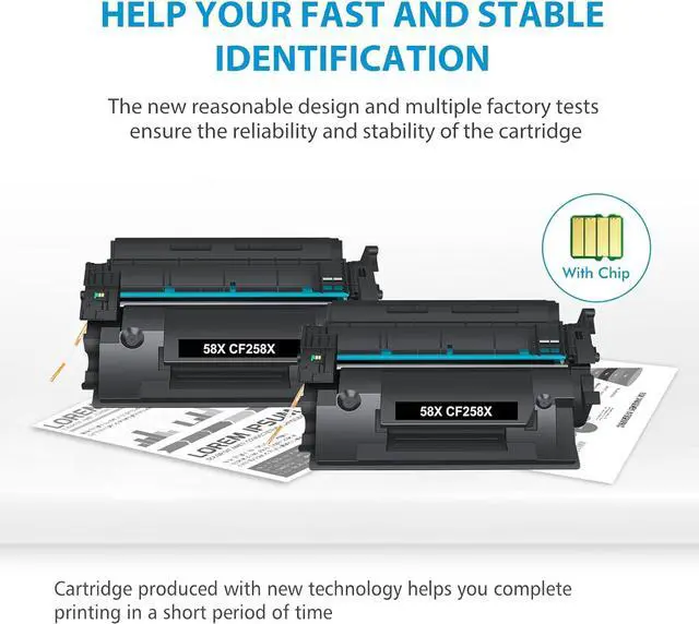Superior quality: High-efficiency 58X with chips toner to get the clear text and vivid color printing. These 58A toner cartridges are alread installed with orginal chips, No need to transfer orginal 58A toner chip to them