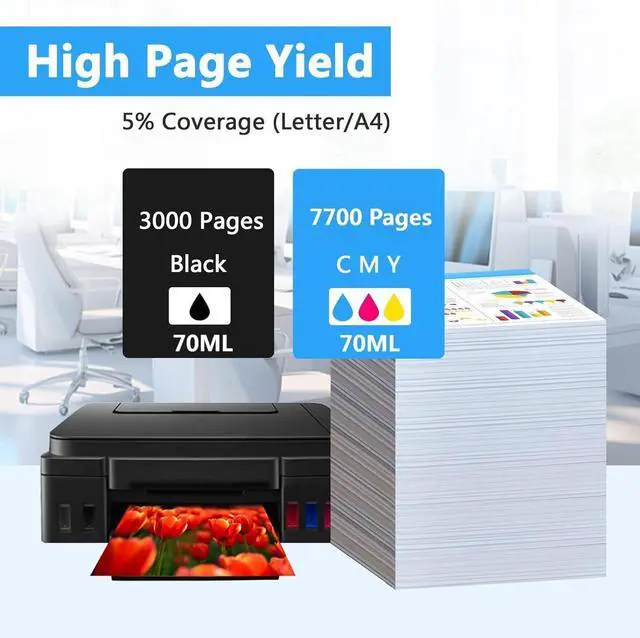 High CapacityExtra-large capacity ink bottle, longer replacement interval. Includes 4 Ink Bottles: Up to 4500 pages per GI25 black ink bottle in 80ml; 9600 pages per GI25 Cyan/Magenta/Yellow ink bottle in 80ml (with 5% Coverage of A4 paper).