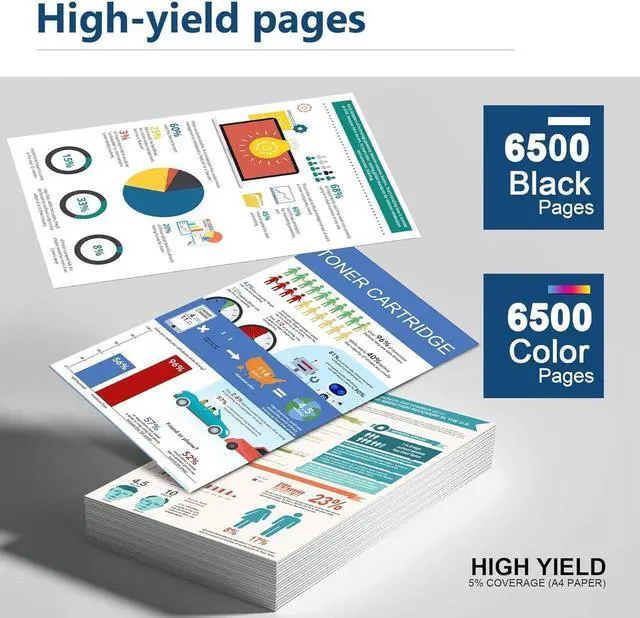 High page rate : 1 pack Black toner can print 6,500 pages & 1 pack Color toner can print 6,500 pages (5% coverage).