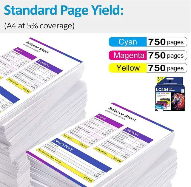 High Yield: Up to 750 pages per LC404 cyan, up to 750 pages per LC404 magenta and up to 750 pages per LC404 yellow (At 5% coverage A4 paper)