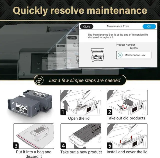 What's In The Box: C9345 maintenance box x 2, PE seal bag x 2. Everything you need to replace the c9345 maintenance tank is in the box, easy to do.