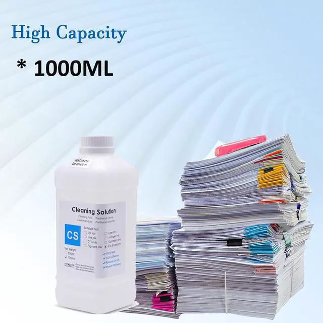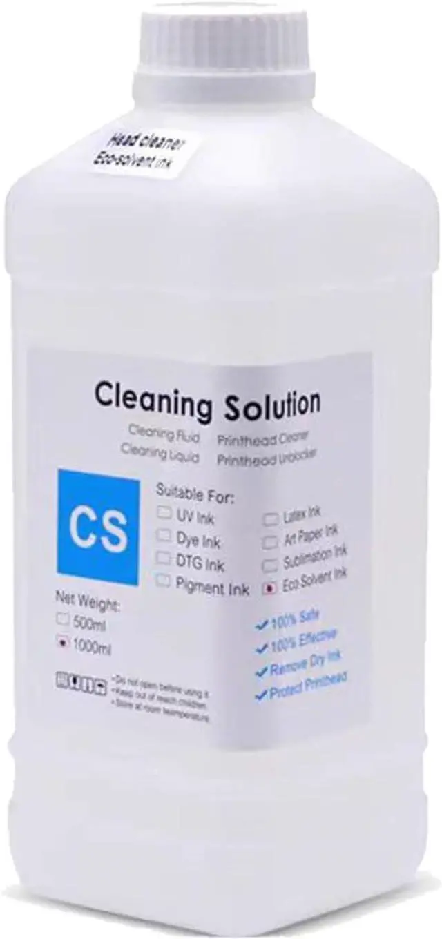 Model Name: 1000ML Eco Solvent Ink Cleaning Solution Color: None Capacity: 1000ML Eco solvent Ink Type: Oil Based Ink Printer Compatibility: For solvent printer. For DX2 DX4 DX5 DX6 DX7 Print Head Or large format inkjet printer
