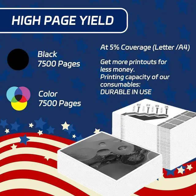 High Capacity: Our products are designed to print more pages, with large capacities that reduce the frequency of replacement. Black (BK/K) Print Pages: 7500 pages. Color Print Pages: 7500 pages (5% coverage on A4 paper)
