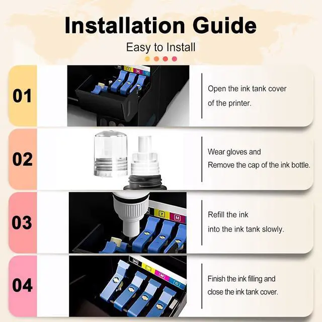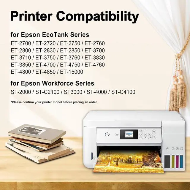 Highly Printer CompatibilityWithout chip, No recognition issues for ET-2760 ET-4760 ET2750 ET-3760 ET-2850 ET-15000 ST-4000 ST-2000 ET-3710 ET-3850 ET-3750 ET-4850 ET-3830 ET4750 ET2700 ST3000 ET3700 ST-C2100 ST-C4100 ET-2720 ET-2800 ET-4700 ET-2830 ET-4800 Printer.