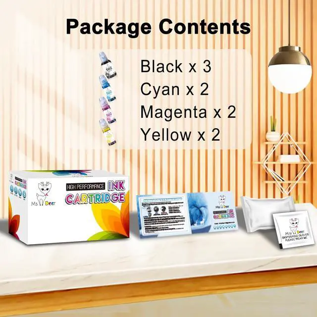 Sealed PackagePrevent Ink Leakage. Package includes 1 x User Guide, 1 x Disposable glove, 3 x Black, 2 x Cyan, 2 x Magenta, 2 x Yellow 502 ink bottles (Total 9 Pack of 502 Ink Refill Bottles).