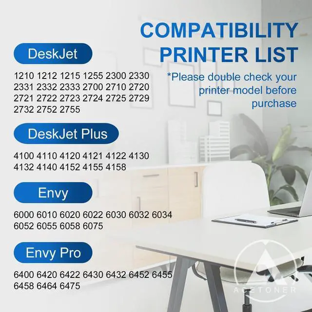 Compatible for: DeskJet 2700 2700e 2710e 2720e 2721e 2722 2722e 2723e 2724 2725 2732 2734e 2742 2742e 2752 2752e 2755 2755e 1255 2855e; DeskJet 4100 4100e 4120e 4121e 4122e 4123e 4130e 4132e 4152e 4155e 4158e 4155; DeskJet Plus 4122 4132 4152 4155 4158 4255e; Envy 6000 6010e 6020e 6022e 6030e 6032e 6034e 6050e 6052 6052e 6055 6055e 6065e 6075 6075e 6420e 6422e 6430e 6432e 6450e 6452e 6455e 6458e 6475e Envy Pro 6455 6458 6475 6452