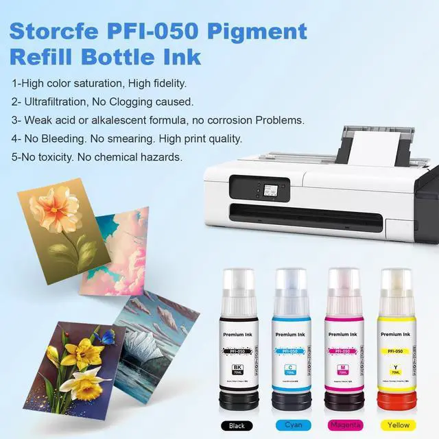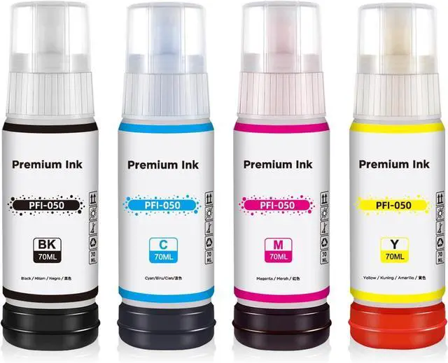 Page Yield 6500 pages for PFI-050 Black/Cyan/Magenta/Yellow ink bottle. Ink Capacity: 70ML PFI050 Pigment Black Ink refill , 70ml PFI050 Pigment Cyan Ink refill, 70ml PFI050 Pigment Magenta Ink refill, 70ml PFI050 Pigment Yellow Ink refill. (At 5% coverage on A4 paper)