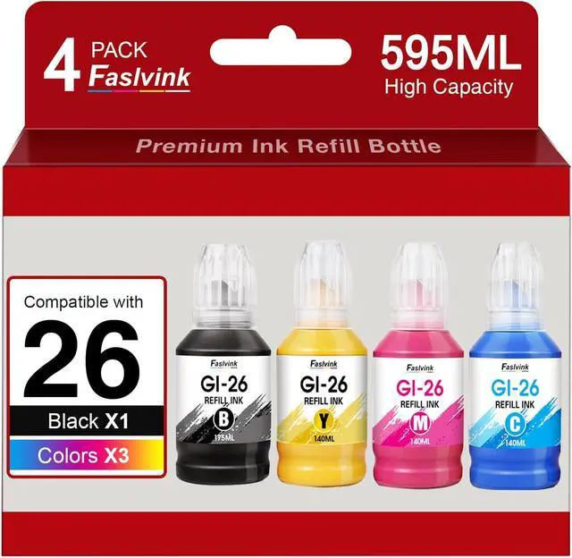 Larger Capacitycompatible for canon GI26 Combo Pack (1 Black, 1 Cyan, 1 Magenta, 1 Yellow).compatible for canon GI-26 black/Color ink bottles 140 ml prints more than 9000 pages/per bottle (A4/5% coverage)