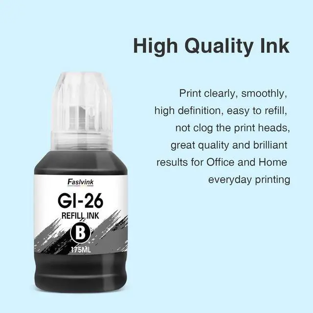 GI26 Ink Refill Bottles Set Include4 Pack compatible for Canon MAXIFY GI26 Ink Bottles (1*140ML GI26 Black Ink Bottles, 1* 70ml GI26 Magenta Ink Bottles, 1* 70ml GI26 Yellow Ink Bottles, 1*140ml GI26 Cyan Ink Bottles). Compatible for Canon GI-26 Refill Bottles, it prints up to 9,000 pages in both black and color (5% coverage).