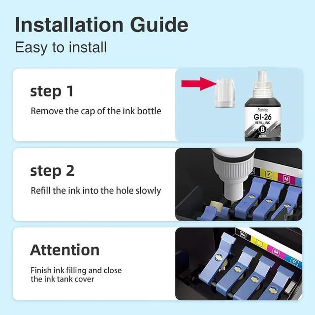 Warm NotePlease confirm whether your printer model is suitable for gi-26 ink bottles before purchasing. Please clean the ink tank and the print head before using these ink bottle refill to reach a better printed effect. Since the dye ink and pigment ink can not be mixed, please check carefully before install the refill ink.