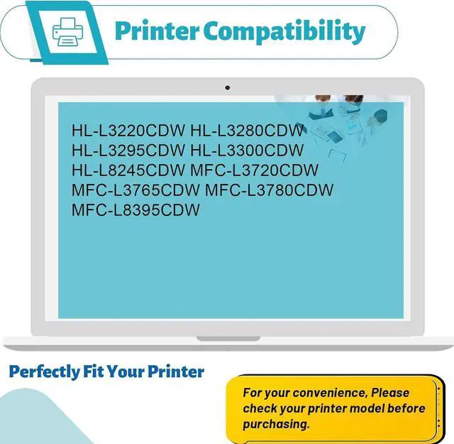 Compatible Printer ModelsFor Brother HL-L3220CDW HL-L3280CDW HL-L3295CDW HL-L3300CDW HL-L8245CDW MFC-L3720CDW MFC-L3765CDW MFC-L3780CDW MFC-L8395CDW Printers. (Easy to be installed and recognized)