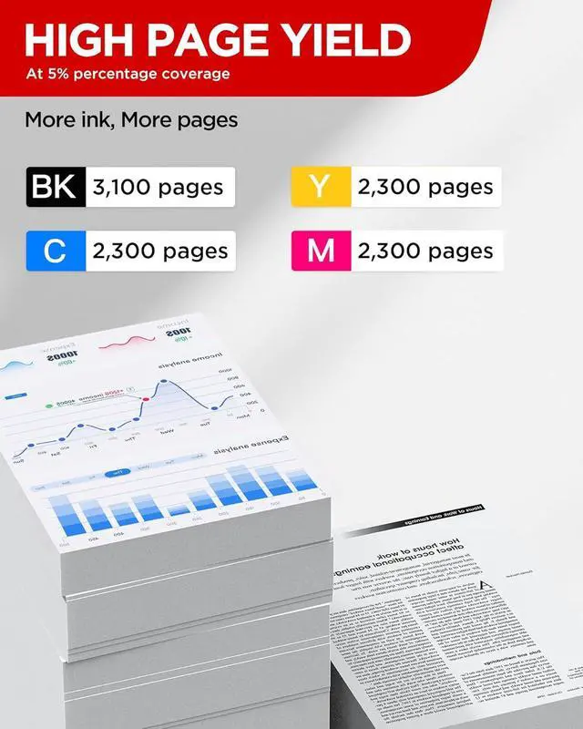 High Page Yield: Print up to 3,100 pages with the black 054H cartridge and 2,300 pages per color (Cyan, Magenta, Yellow) at 5% coverage (A4). More pages than standard 054 toners.