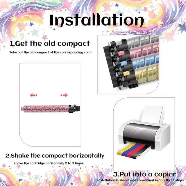 Installation guides:1. Turn off the printer, open the printer cover and remove the used cartridge
