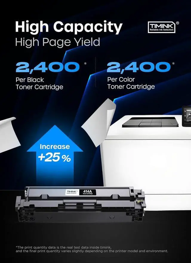High Page Yield: Up to 2,400 pages per 414A (W2020A) Black High Yield Toner Cartridge, 2,100 pages for per 414A W2021A W2022A W2023A C/M/Y toner(5% coverage at A4 paper)
