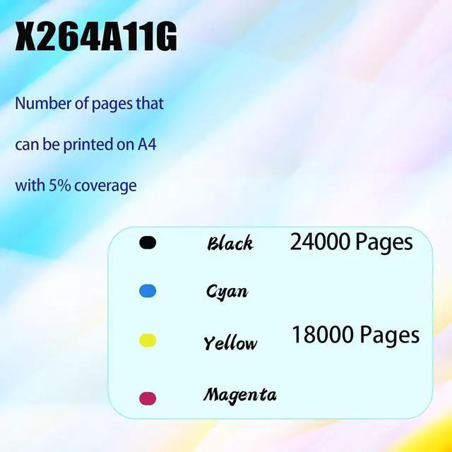 [A4 paper 5% coverage] Each black Toner Cartridge can print 24000 pages. Each color Toner Cartridge can print 18000 pages.