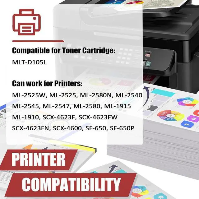 High compatibilityMLT-D105L toner cartridges are specially designed to be compatible for Samsung ML-2525W, ML-2525, ML-2580N, ML-2540, ML-2545, ML-2547, ML-2580, ML-1915, ML-1910, SCX-4623F, SCX-4623FW, SCX-4623FN, SCX-4600, SF-650, SF-650P Printers.