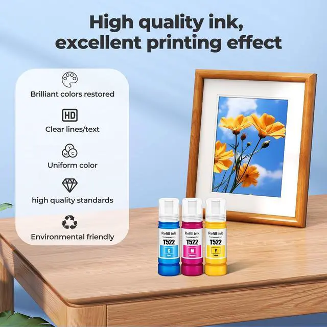 Upgraded Formula to Create 522 Color Ink: Trokliey 522 ink refill bottles uses the latest and ink formula, and the product has been rigorously tested. Replacement for Epson 522 ink can print clear text and patterns, bright and lasting colors, the ink is smooth and even, does not clog, does not fade, and is perfectly compatible.