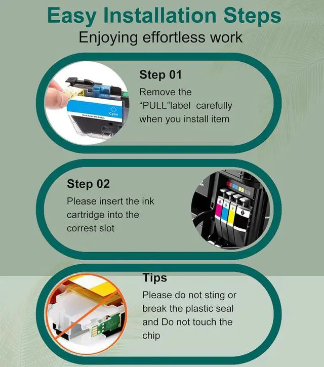 Easy to install : Tear off the label maked "PULL". Insert the cartridge into thecorresponding slot. Note : Do not touch the chip or the ink nozzles. TipIf prompted for this Printer error "cartridge not recognized","The printer does not have enough ink"Please reinstall the cartridge until it is recognized.
