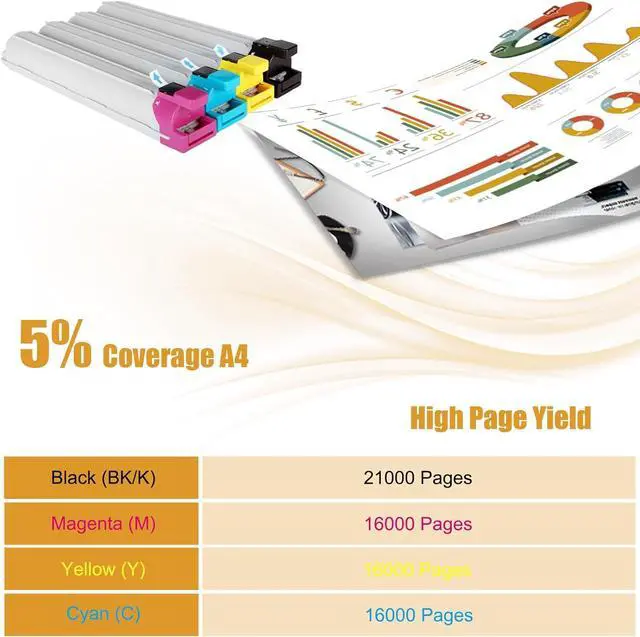 Page Yield: Up to 21000 pages per Toner Cartridges (Black) at 5% coverage. Up to 16000 pages per color Toner Cartridges (Cyan, Magenta, Yellow) at 5% coverage. These Toner Cartridges provides clear and vibrant printing effect, which gives you a good visual feast.