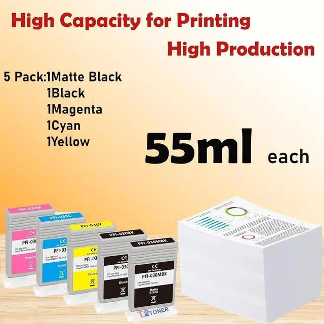 Package contents: 5 Pack PFI-030 Ink Tank Set(1Matte Black, 1Black, 1Cyan, 1Magenta, 1Yellow)