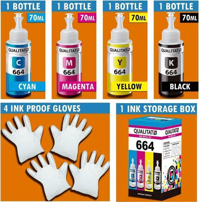 [ -4 COLOR SET PACK CONTENTS- ] - High Quality Refill Inks for T664 / epson 664 ecotank ink: 1xBLACK-70ml Bottle 1xCYAN-70ml Bottle 1xMAGENTA-70ml Bottle 1xYELLOW-70ml Bottle, 2 PAIRS of GLOVES are included. A compatible epson ink set for your ecotank needs. Refill when you need it.