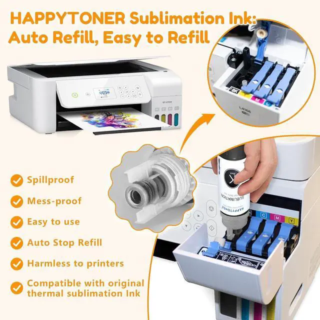 Professional CompatibilityHAPPYTONER sublimation ink refilled for EcoTank ET-2700, ET-2720, ET-2750, ET-2760, ET-2800, ET-2803, ET-2850, ET-3700, ET-3710, ET-3750,ET-3760, ET-3830, ET-3850, ET-4700, ET-4750, ET-4760, ET-15000, L3110, L3150 printer etc.