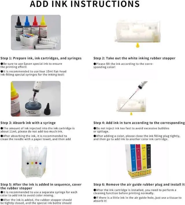 Usage & Installation TipsChipless cartridges, you need to prepare chips yourself and install it on the cartridge before adding ink. Empty ink cartridges can only be filled with 90% ink to prevent ink from overflowing and contaminating printer during use. Any questions about the item, please feel free to contact us.