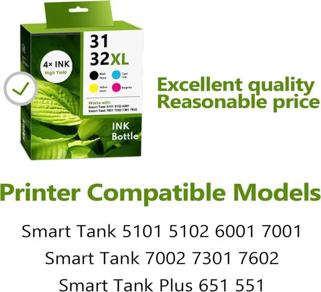 32XL/31 ink bottle to use with: Smart Tank 5101 5102 6001 7001 7002 7301 7602 Plus 651 551 Ink Tank Printer