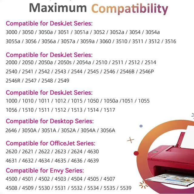 Works for HP DeskJet 1000, 1010, 1011, 1012, 1015, 1050, 1050A, 1051, 1055, 1056, 1510, 1511, 1512, 1513, 1514, 1517, 2000, 2050, 2050A, 2050s, 2054A, 2510, 2511, 2512, 2514, 2540, 2541, 2542, 2543, 2544, 2545, 2546, 2547, 2548, 2549, 3000, 3050, 3050A, 3051A, 3052A, 3054, 3054A, 3055A, 3056A, 3057A, 3059A, 3060, 3510, 3511, 3512, 3516 Printer
