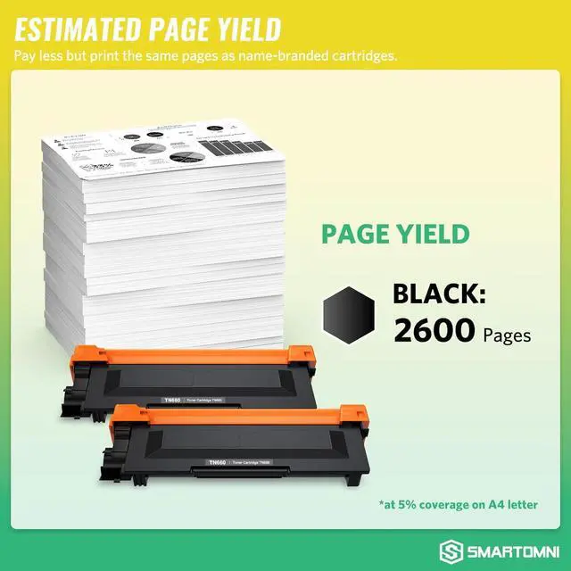 Estimated Page Yield: Per Black toner can print 2600 Pages at 5% coverage of Letter/A4 as usual